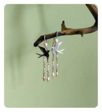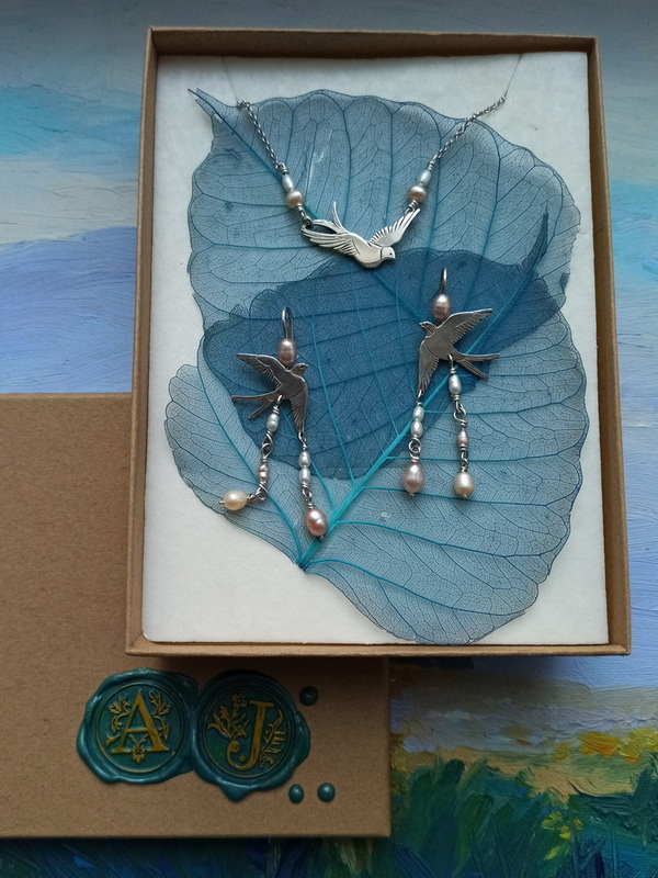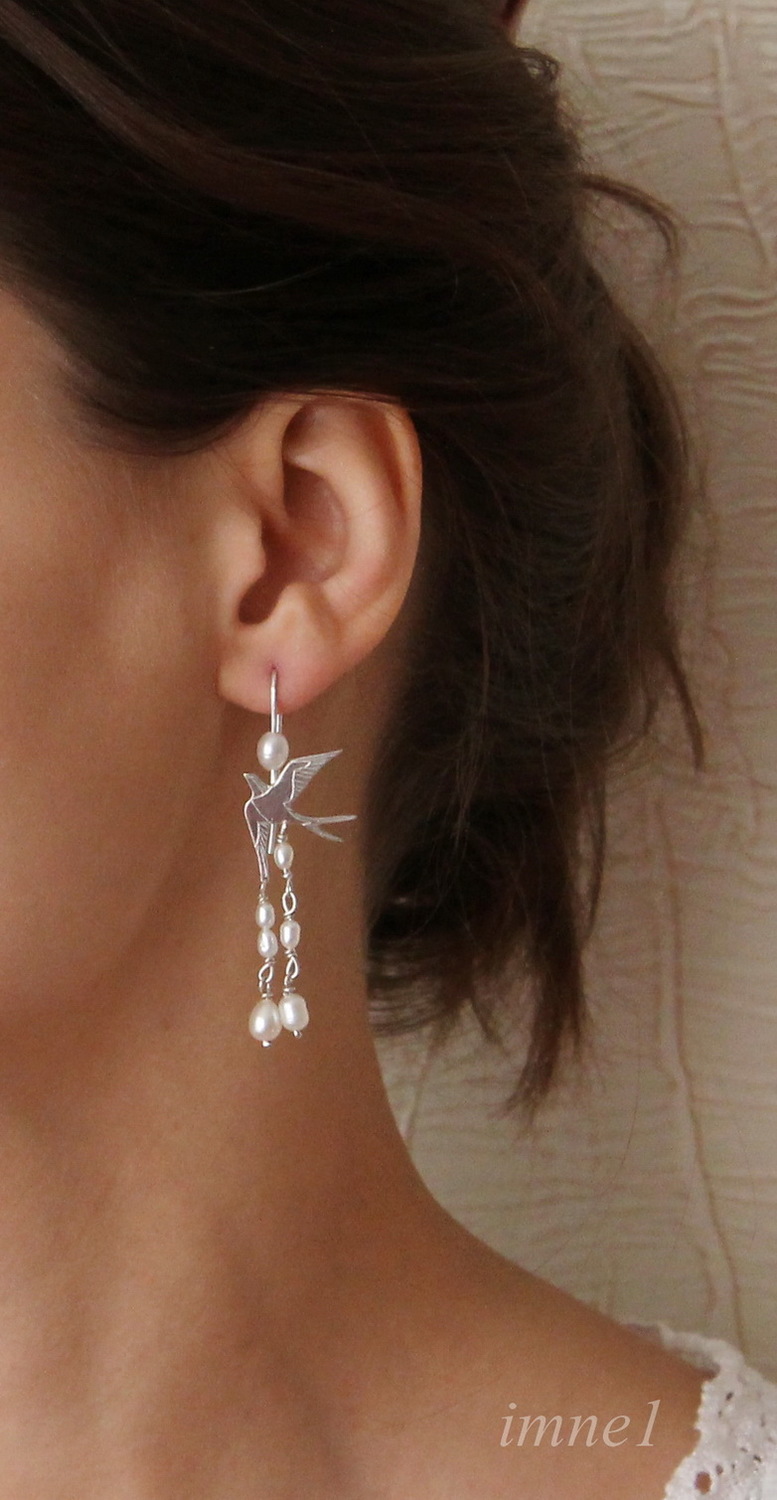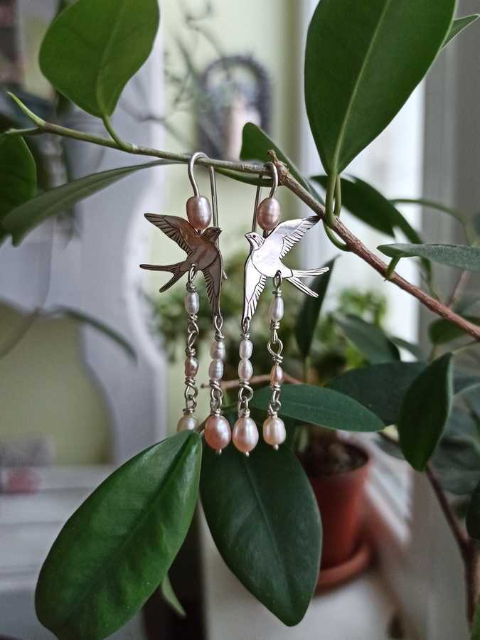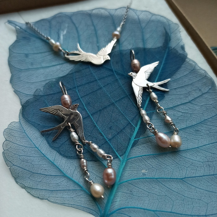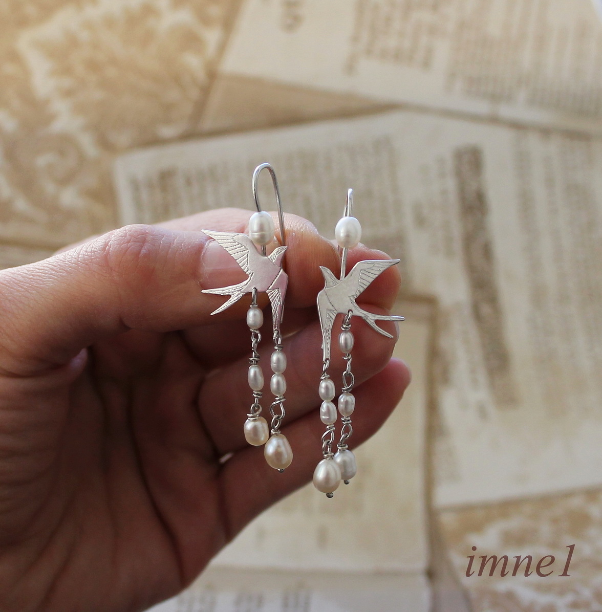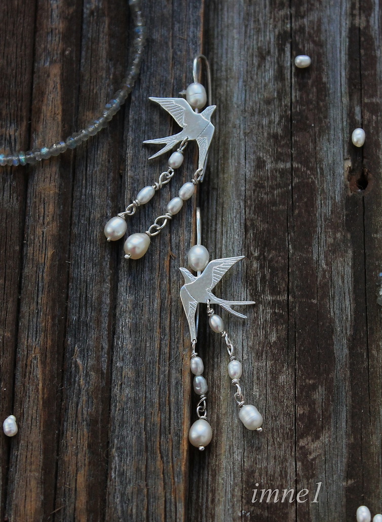 Стремительные летящие ласточки и миниатюрные натуральные жемчужинки -- нежное и изящное сочетание..
