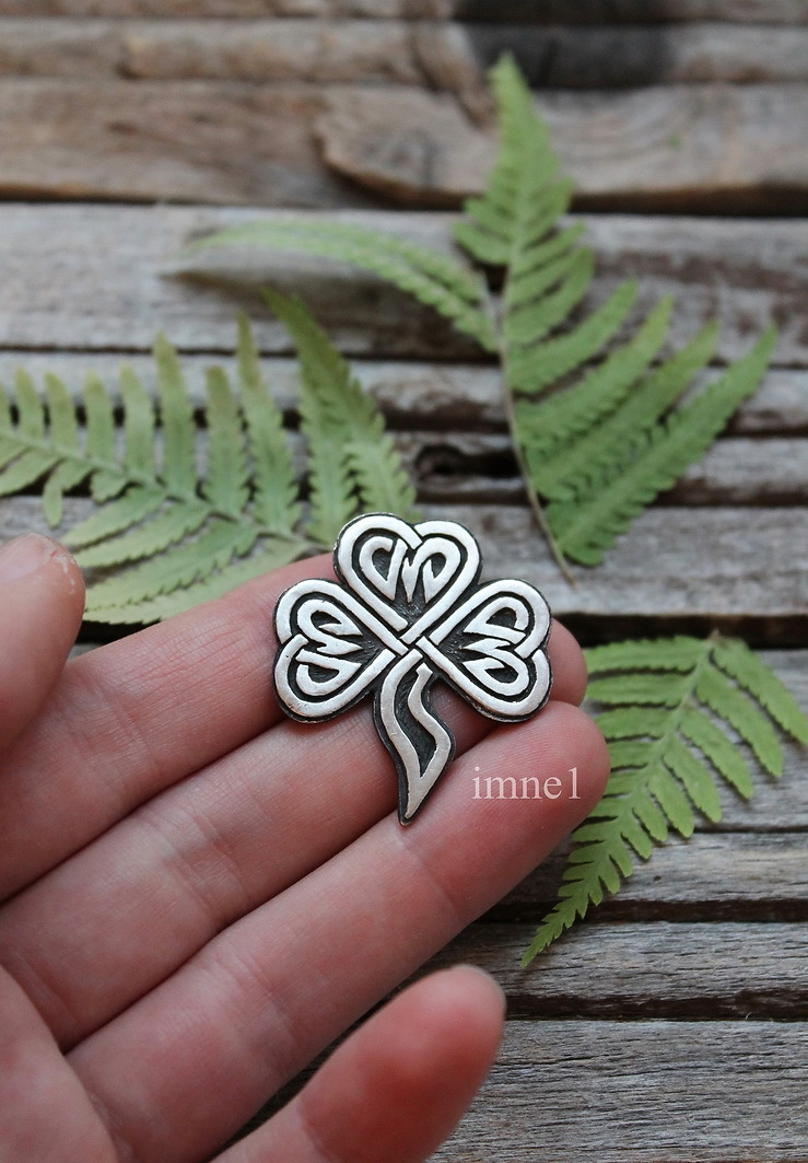Ушко для цепочки или шнурка спрятано сзади, чтобы не портить очертания трилистника.